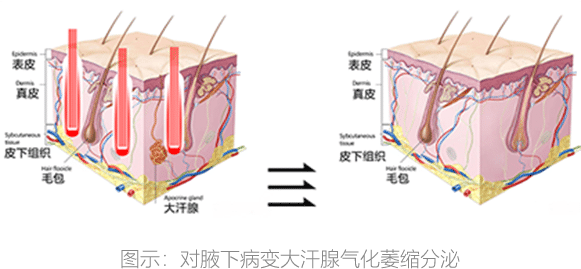 射频能量在均匀作用异常汗腺同时激活腋下细胞,促进胶原蛋白及纤维细胞增生及新陈代谢,达到治疗后腋下无创的效果。